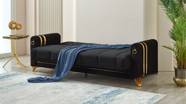Диван Клара впечатлява с елегантност, изчистени линии и стилна визия. Извитите подлакътници, обкантени вертикално с декоративен кант и крака в златно, в комбинация с фигуралните шевове по дамаската и умело подбрания ѝ цвят, го превръщат в истинско интериорно бижу.