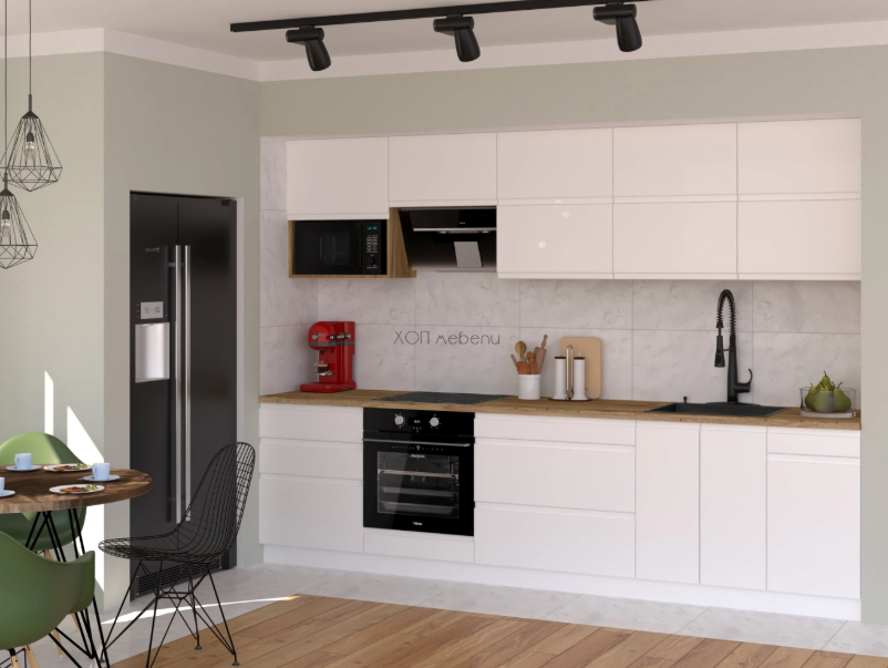 Модулна кухня Влада 3 м. в бяла коприна с височина на горния ред 72 см. С място за вграждане на микровълнова, място за абсорбатор и шкаф с място за вграждане на печка. С лице от боядисан МДФ и модерни фрезовани дръжки.