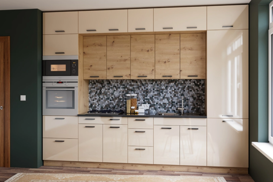 Кухня Марта 3,2 м. златен дъб и бежов гланц