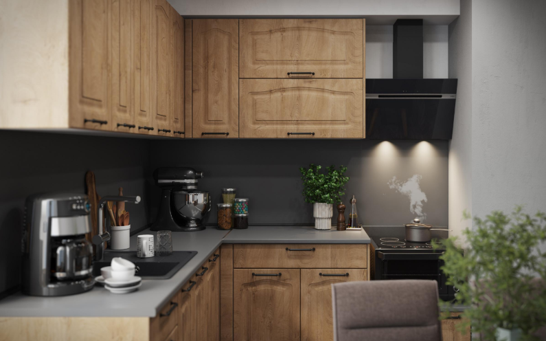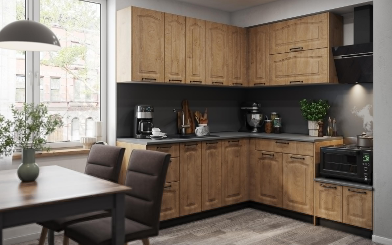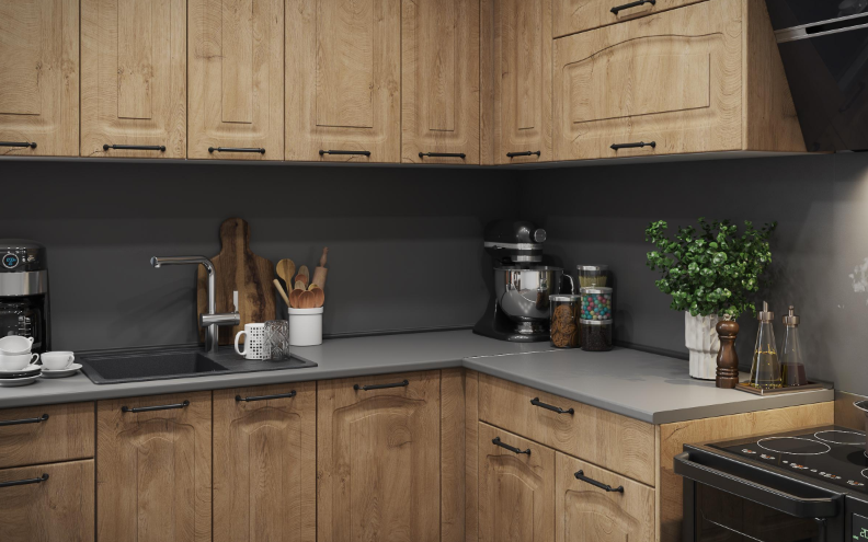 Кухненското обзавеждане включва горен ред шкафове, долен ред шкафове, горна и долна страница.