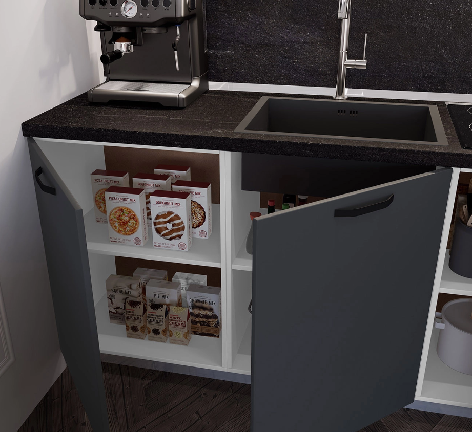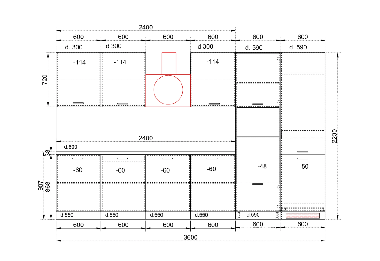 Долен ред - 3600 / 600 / 2230 - дълбочина на шкафовете под плот 550мм