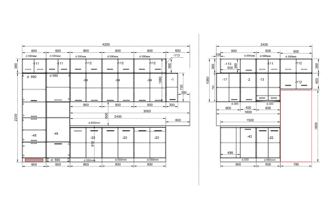 Долен ред - 4200 / 1600 / 2230 - дълбочина на шкафовете под плот 550мм