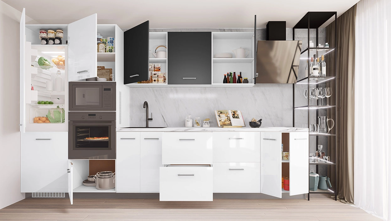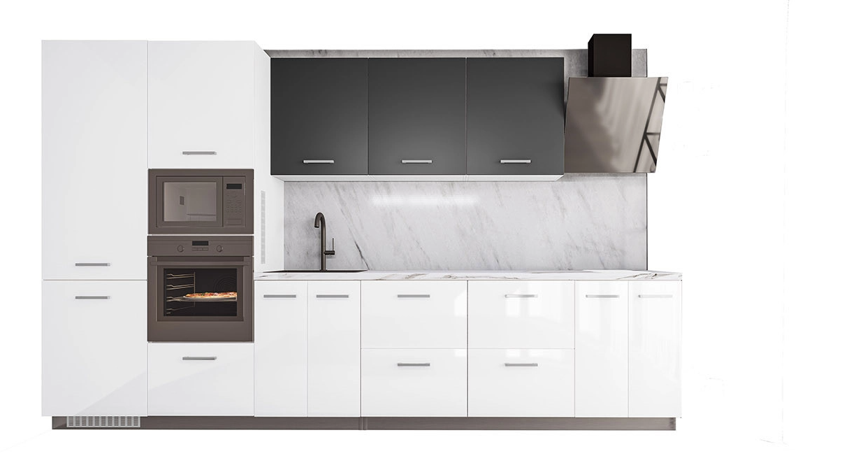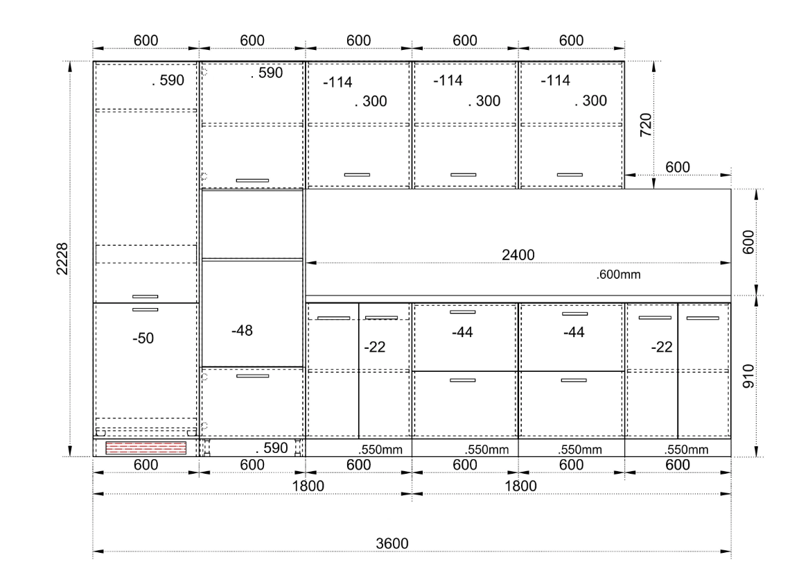 Долен ред - 3600 / 600 / 2230 - дълбочина на шкафовете под плот 550мм